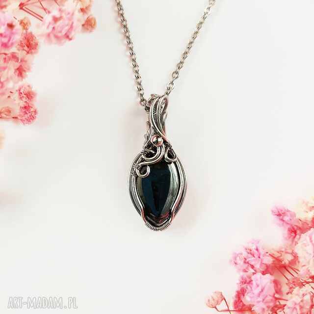 Naszyjnik Hematyt Srebrny ręcznie wykonany z drutów ze stali chirurgicznej metodą wire wrapping.