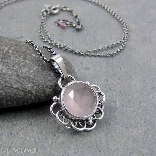 Delikatny, pastelowy wisiorek dla romantyczki. Wykonałam go od podstaw ręcznie za srebra próby 925, które przyciemniłam i wypolerowałam, a także z fasetowanego kwarcu różowego. Wisiorek ma ok. 2,3 cm wysokości razem z krawatką i ok. 1,7 cm szerokości, a łańcuszek, na którym jest zawieszony ma długość ok. 44,5 cm z możliwością regulacji do 48,5 cm. Biżuterię wysyłam zapakowaną w ozdobne pudełeczko.