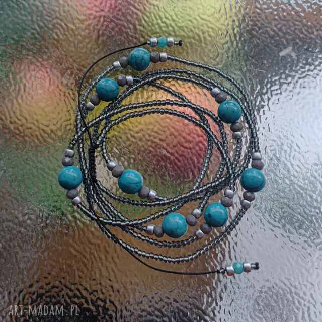 Bransoletka z pięknego howlitu de lux z połyskiem, szkło, howlit. Bransoletka na sznurku syntetycznym. Koraliki szklane czeskie Preciosa i Matubo. Kryształki szklane szare fasetowane 3x4 mm. Kulki howlitu 8 mm w kolorze turkusowym z czarnymi żyłkami. Zapięcie wyplecione ściegiem makramowym pozwala na regulacje objętości. Doskonale sprawdzi się jako naszyjnik długi ok 50 cm, delikatny, lub dwukrotnie owinięty wokół szyi.