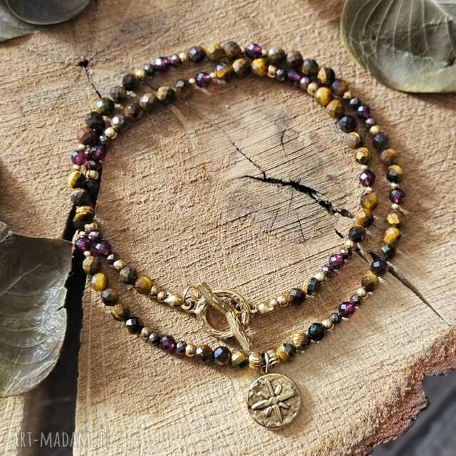 Jeden z najgorętszych obecnie trendów biżuteryjnych - choker z zawieszką oraz tygrysim okiem, granatem i hematytem! Ten zjawiskowy naszyjnik zachwyca jesiennymi kolorami, podkręcając każdą, nawet casualową stylizację! Choker uzupełniony został modnym zapięciem typu toggle o pięknej, rzeźbionej fakturze oraz dodatkami ze stali szlachetnej. Świetnie skomponuje się z jesiennymi swetrami, uzupełni stylizacje w odcieniach czekoladowego brązu, karmelu, bordo i wielu innych!