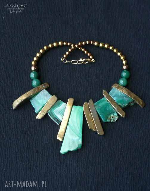 Moja niezmiernie spektakularna, efektowna i elegancka kompozycja naszyjnika z 5 wielkich surowych naturalnych zielony agatów, 7 podłużnych pozłacanych surowych agatów i graduowanych kulek złotego hematytu, Długość ok. 45 cm regulacja.
