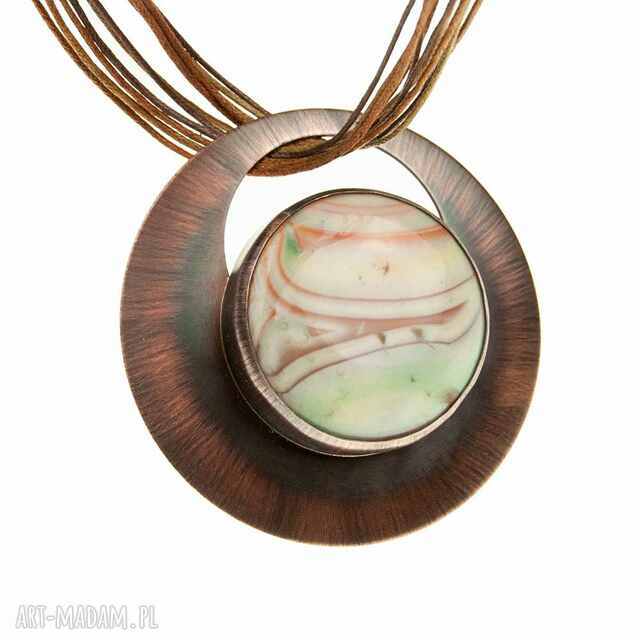 Agatowe krajobrazy to kolekcja naszyjników z agatami. Ten wyjątkowy wisior został wykonany z miedzi i agatu o średnicy około 40-45 mm. Miedziana blacha o średnicy około 7 cm była polerowana, matowiona, oksydowana i przecierana, aby uzyskać interesujący efekt kolorystyczny. Centralnym elementem wisiora jest unikalny agat. Wisior jest lekko wypukły i pokryty warstwą ochronną. Ozdobnie zapakowany wisior sprzedawany jest ze sznurkiem jubilerskim (kolor może się różnić od zdjęcia), długości około 45 cm, z możliwością wydłużenia do 60 cm na życzenie.