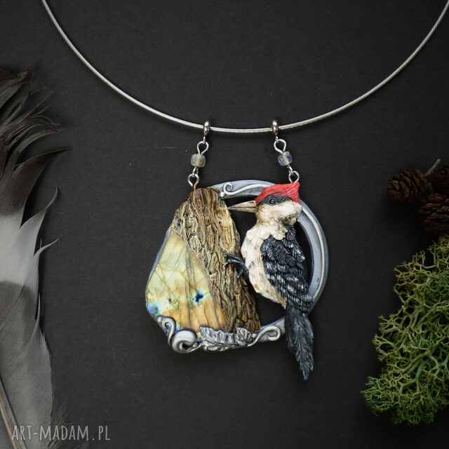 Ten naszyjnik jest właśnie zatrzymaniem czasu w takim momencie. Ręcznie rzeźbiony dzięcioł przysiadł na fragmencie starego pnia, a w korę drzewa został wkomponowany plaster labradorytu, który mieni się jak leśne światło schowane tuż pod powierzchnią. To biżuteria dla osoby, która czuje się najlepiej tam, gdzie szumią drzewa, a kieszenie płaszcza zawsze pełne są drobnych skarbów z leśnych spacerów.