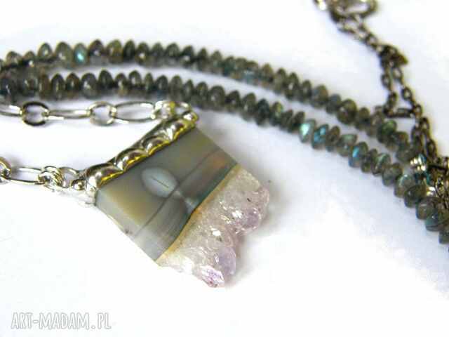 Naszyjnik: z ametystową geodą i labradorytami to delikatny naszyjnik dla miłośników minerałów (i nie tylko) wykonany w technice Tiffaniego, z kamieni półszlachetnych: szczotki ametystowej oprawionej cynę i drobnych labradorytów.