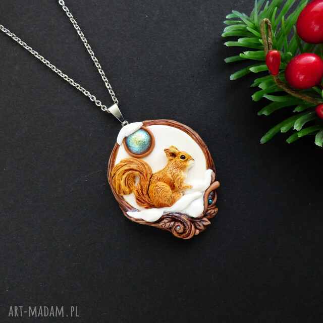 Zawieszkę wykonałam w technice tworzenia miniaturowej rzeźby z glinki polimerowej, barwionej i cieniowanej suchymi pastelami oraz farbami akrylowymi. Oczy wiewiórki wykonałam z czarnego onyksu. Konstrukcja zawieszki osadzona jest na metalowej bazie ze stali szlachetnej, aby zapewnić maksymalną trwałość i komfort noszenia.