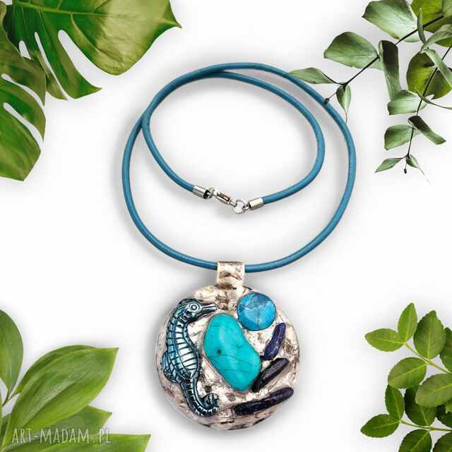 handmade naszyjnik z witrażowym wisiorem konik morski hematyt, howlit, lapis lazuli
