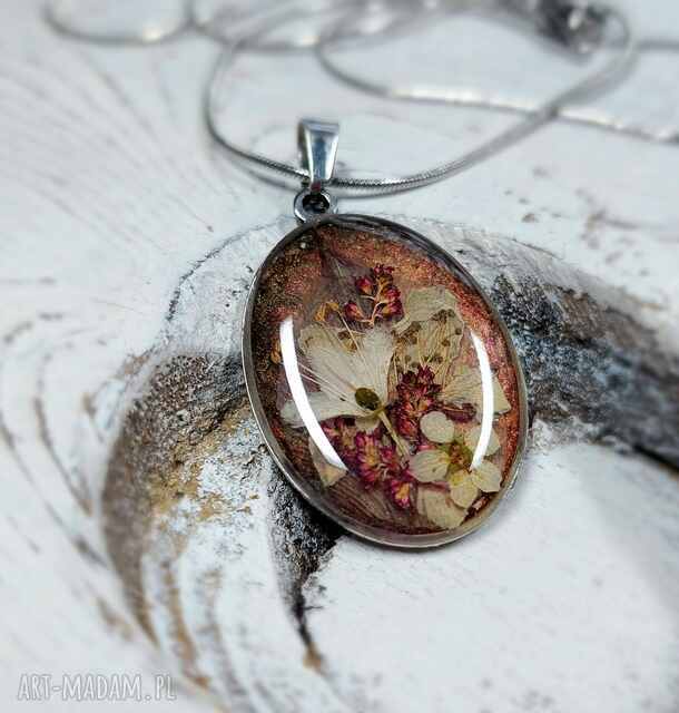 Zjawiskowy naszyjnik z suszonymi, naturalnymi kwiatami zalanymi żywicą UV. Na perłowym brązowym tle suszone kwiaty w odcieniach i bieli, beżu i bordo. To cudowna kompozycja w vintage klimacie. Do naszyjnika solidny łańcuszek o dł 45cm, wszystko wykonane ze stali nierdzewnej.