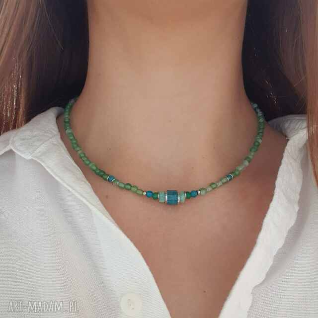 Wielobarwny naszyjnik z naturalnych kamieni. Ozdobiony kulami zielonego agatu, niebieskiego apatytu oraz oponkami amazonitu i jadeitu. Centrum naszyjnika stanowi nieregularna bryłka apatytu. Naszyjnik wykonany z antyalergicznej stali szlachetnej.