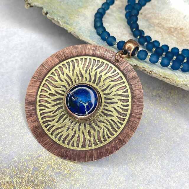 Miedziany wisior z jaspisem cesarskim zachwyca głęboką, niebieską barwą kamienia, który został osadzony w centrum oprawy. Jego formę podkreśla dekoracyjny, ażurowy element z mosiądzu układający się w promienisty motyw rozety, wyraźnie kontrastujący z patynowaną miedzią. Teksturowanie metalu nadaje całości artystyczny charakter i szlachetne wykończenie, widoczne w każdym detalu. Wisior zawieszony jest na naszyjniku ze szklanych koralików o średnicy 4-5 mm, dobranych kolorystycznie do odcienia jaspisu.